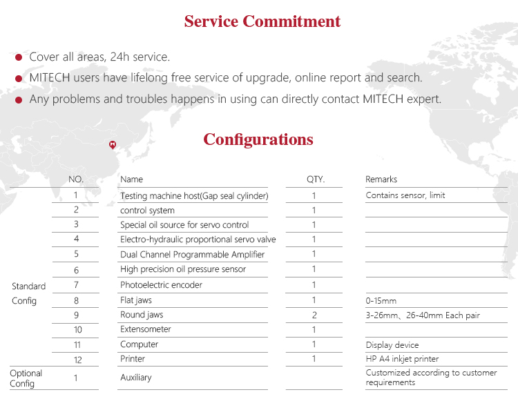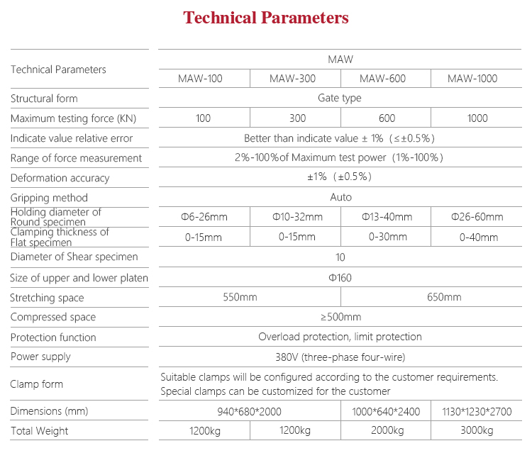 Mitech MAW micro control series hydraulic universal testing machine , can conduct mechanical properties tests for metallic, non-metallic and composite materials including stretching, compression, bending, cutting, stripping, tearing and so on ,through controlling the high-pressure pump to drive the screw movement and equipped with the corresponding auxiliary. It uses manual and electro-hydraulic servo dual control mode, high-precision gap sealed cylinder, digital processing, closed-loop control technology, which has stable property, powerful function, accurate data processing, solid and simple structure, high reliability, simple performance, friendly interface. This product can be widely used in areas such as metallic and non-metallic processing industry, quality testing in quality inspection departments, scientific research in higher education institutions , which is a necessary professional precision testing equipment to improve production efficiency and save production costs.
