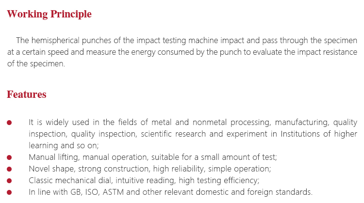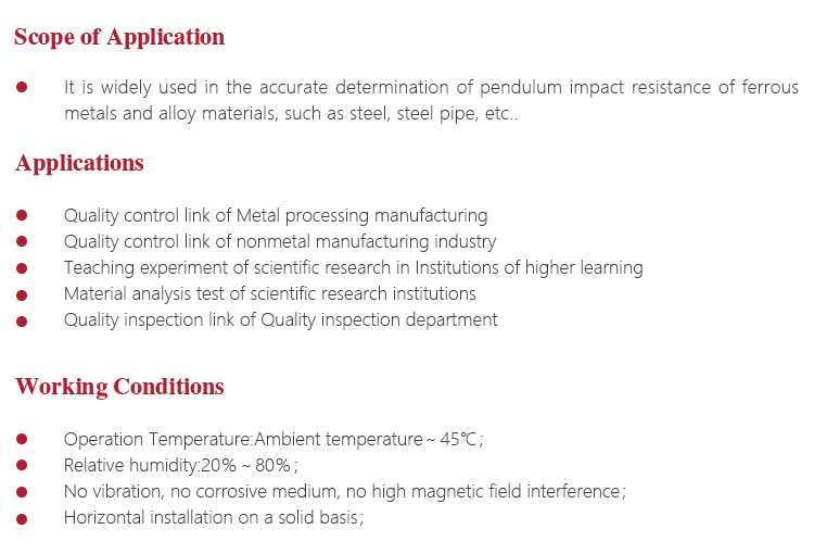 It is widely used in the accurate determination of pendulum impact resistance of ferrous metals and alloy materials, such as steel, steel pipe, etc..