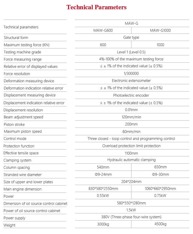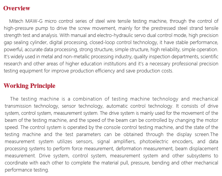 Mitech MAW-G micro control series of steel wire tensile testing machine, through the control of high-pressure pump to drive the screw movement, mainly for the prestressed steel strand tensile strength test and analysis. With manual and electro-hydraulic servo dual control mode, high precision gap sealing cylinder, digital processing, closed-loop control technology, it have stable performance, powerful, accurate data processing, strong structure, simple structure, high reliability, simple operation. It’s widely used in metal and non-metallic processing industry, quality inspection departments, scientific research and other areas of higher education institutions and it’s a necessary professional precision testing equipment for improve production efficiency and save production costs.