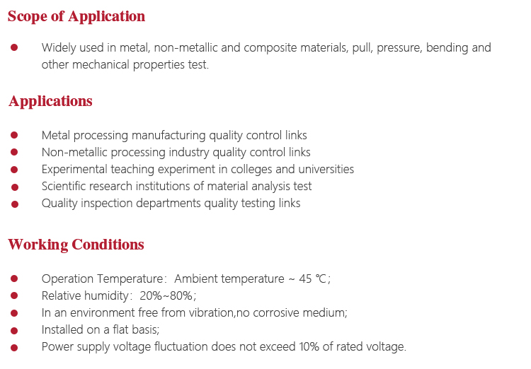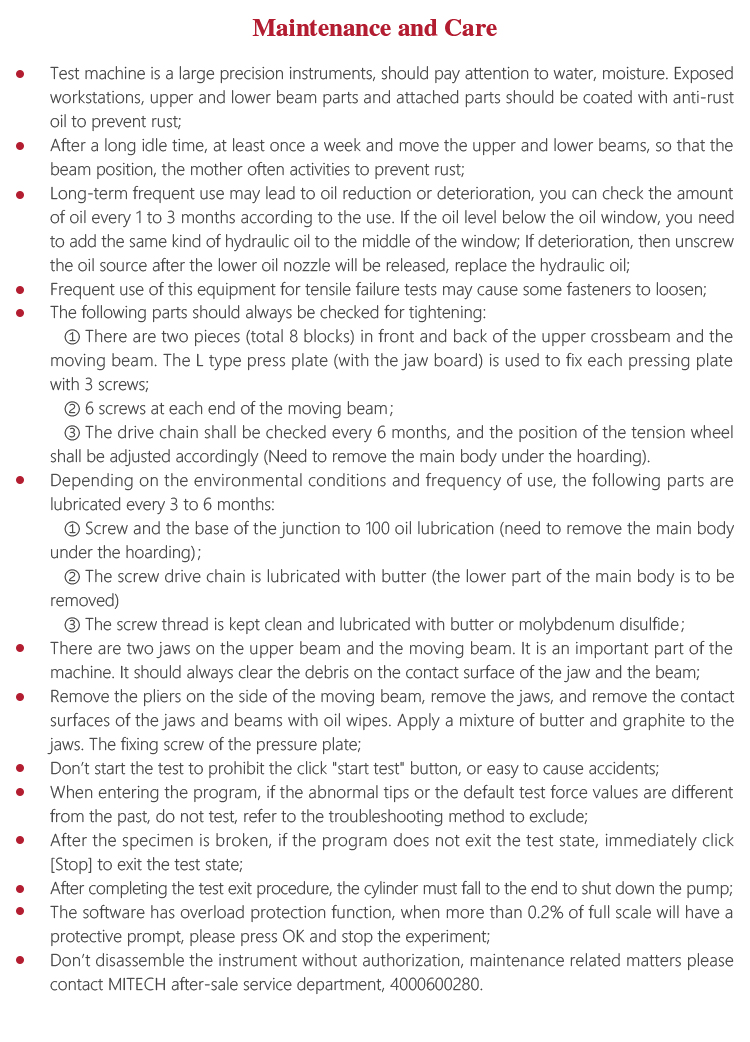 l Test machine is a large precision instruments, should pay attention to water, moisture. Exposed workstations, upper and lower beam parts and attached parts should be coated with anti-rust oil to prevent rust;