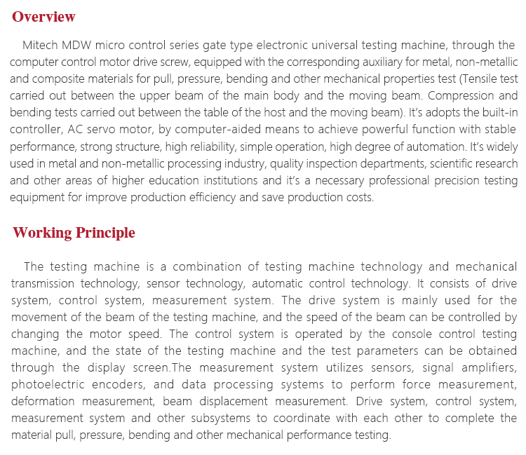 Mitech MDW micro control series gate type electronic universal testing machine, through the computer control motor drive screw, equipped with the corresponding auxiliary for metal, non-metallic and composite materials for pull, pressure, bending and other mechanical properties test (Tensile test carried out between the upper beam of the main body and the moving beam. Compression and bending tests carried out between the table of the host and the moving beam). It’s adopts the built-in controller, AC servo motor, by computer-aided means to achieve powerful function with stable performance, strong structure, high reliability, simple operation, high degree of automation. It’s widely used in metal and non-metallic processing industry, quality inspection departments, scientific research and other areas of higher education institutions and it’s a necessary professional precision testing equipment for improve production efficiency and save production costs.