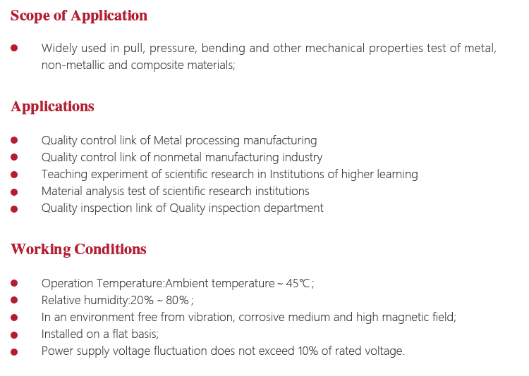 <!--[if !supportLists]--> l <!--[endif]-->Test machine is a large precision instruments, should pay attention to water, moisture. Exposed workstations, upper and lower beam parts and attached parts should be coated with anti-rust oil to prevent rust;