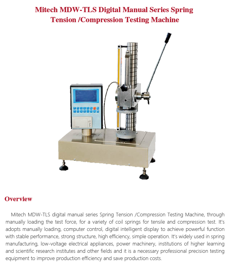 Mitech MDW-TLS digital manual series Spring Tension /Compression Testing Machine, through manually loading the test force, for a variety of coil springs for tensile and compression test. It’s adopts manually loading, computer control, digital intelligent display to achieve powerful function with stable performance, strong structure, high efficiency, simple operation. It’s widely used in spring manufacturing, low-voltage electrical appliances, power machinery, institutions of higher learning and scientific research institutes and other fields and it is a necessary professional precision testing equipment to improve production efficiency and save production costs.