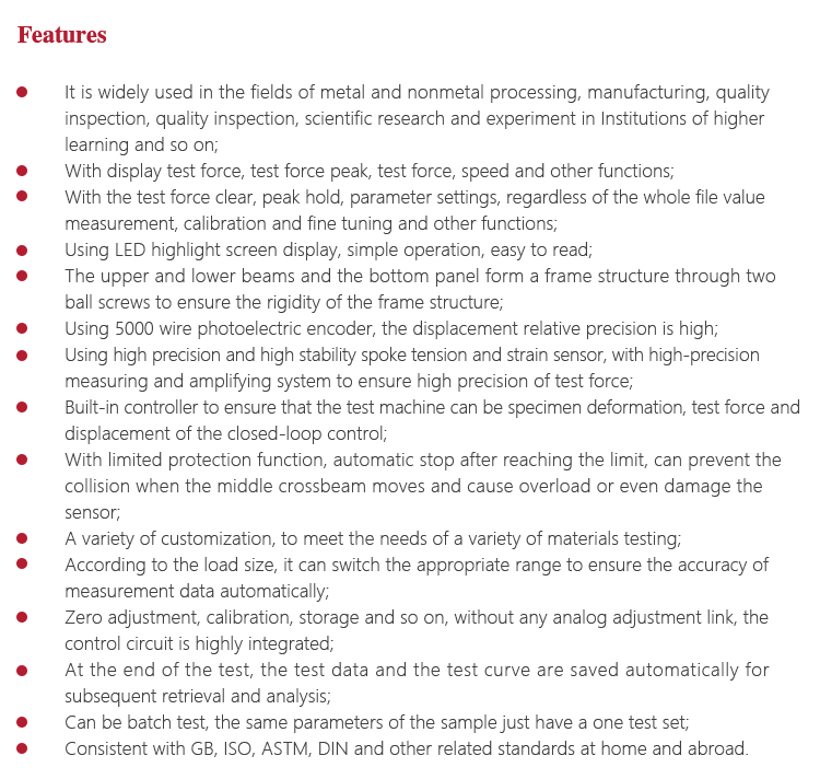 <!--[if !supportLists]--> l <!--[endif]-->Test machine is a large precision instruments, should pay attention to water, moisture. Exposed workstations, upper and lower beam parts and attached parts should be coated with anti-rust oil to prevent rust;