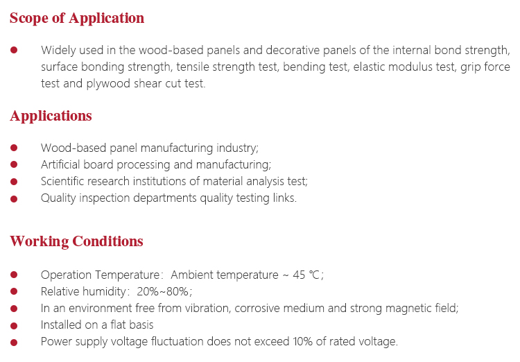 l Widely used in the wood-based panels and decorative panels of the internal bond strength, surface bonding strength, tensile strength test, bending test, elastic modulus test, grip force test and plywood shear cut test;