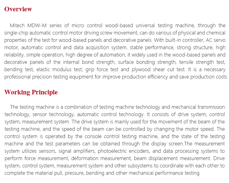 Mitech MDW-M series of micro control wood-based universal testing machine, through the single-chip automatic control motor driving screw movement, can do various of physical and chemical properties of the test for wood-based panels and decorative panels. With built-in controller, AC servo motor, automatic control and data acquisition system, stable performance, strong structure, high reliability, simple operation, high degree of automation, it widely used in the wood-based panels and decorative panels of the internal bond strength, surface bonding strength, tensile strength test, bending test, elastic modulus test, grip force test and plywood shear cut test. It is a necessary professional precision testing equipment for improve production efficiency and save production costs.