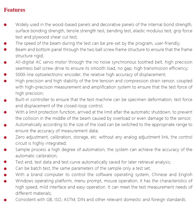 l Widely used in the wood-based panels and decorative panels of the internal bond strength, surface bonding strength, tensile strength test, bending test, elastic modulus test, grip force test and plywood shear cut test;