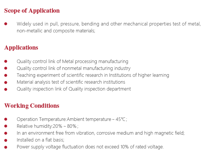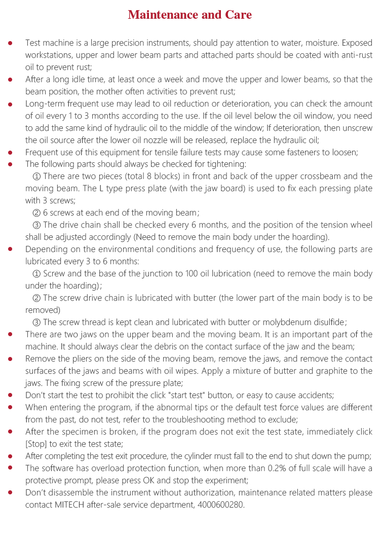 <!--[if !supportLists]--> l <!--[endif]-->Test machine is a large precision instruments, should pay attention to water, moisture. Exposed workstations, upper and lower beam parts and attached parts should be coated with anti-rust oil to prevent rust;