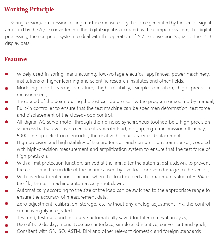 Mitech MDW-S digital display series gantry landing type Spring Tension/Compression Testing Machine, through the single-chip automatic control motor driving screw movement, for a variety of coil springs for tensile and compression test. it use of built-in controller, AC servo motor, automatic control and data acquisition system, stable performance, strong structure, high reliability, simple operation, high degree of automation. Widely used in spring manufacturing, low-voltage electrical appliances, power machinery, institutions of higher learning and scientific research institutes and other fields.It is the necessary professional precision testing equipment for improving production efficiency and saving production costs.