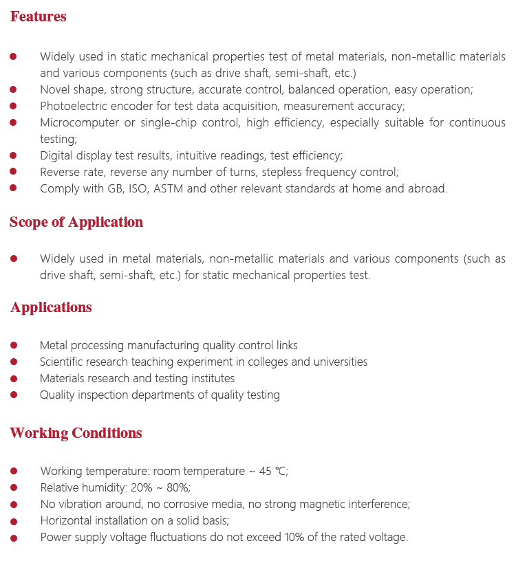 l Widely used in static mechanical properties test of metal materials, non-metallic materials and various components (such as drive shaft, semi-shaft, etc.)