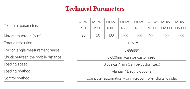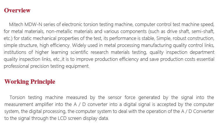 Mitech MDW-N series of electronic torsion testing machine, computer control test machine speed, for metal materials, non-metallic materials and various components (such as drive shaft, semi-shaft, etc.) for static mechanical properties of the test, its performance is stable, Simple, robust construction, simple structure, high efficiency. Widely used in metal processing manufacturing quality control links, institutions of higher learning scientific research materials testing, quality inspection department quality inspection links, etc.,it is to improve production efficiency and save production costs essential professional precision testing equipment.