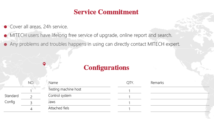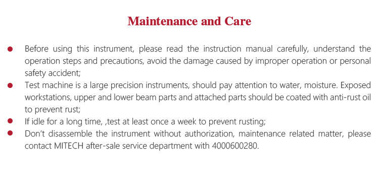 l Test machine is a large precision instruments, should pay attention to water, moisture. Exposed workstations, upper and lower beam parts and attached parts should be coated with anti-rust oil to prevent rust;