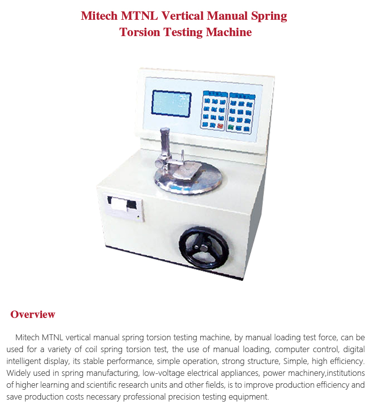 Mitech MTNL vertical manual spring torsion testing machine, by manual loading test force, can be used for a variety of coil spring torsion test, the use of manual loading, computer control, digital intelligent display, its stable performance, simple operation, strong structure, Simple, high efficiency. Widely used in spring manufacturing, low-voltage electrical appliances, power machinery,institutions of higher learning and scientific research units and other fields, is to improve production efficiency and save production costs necessary professional precision testing equipment.