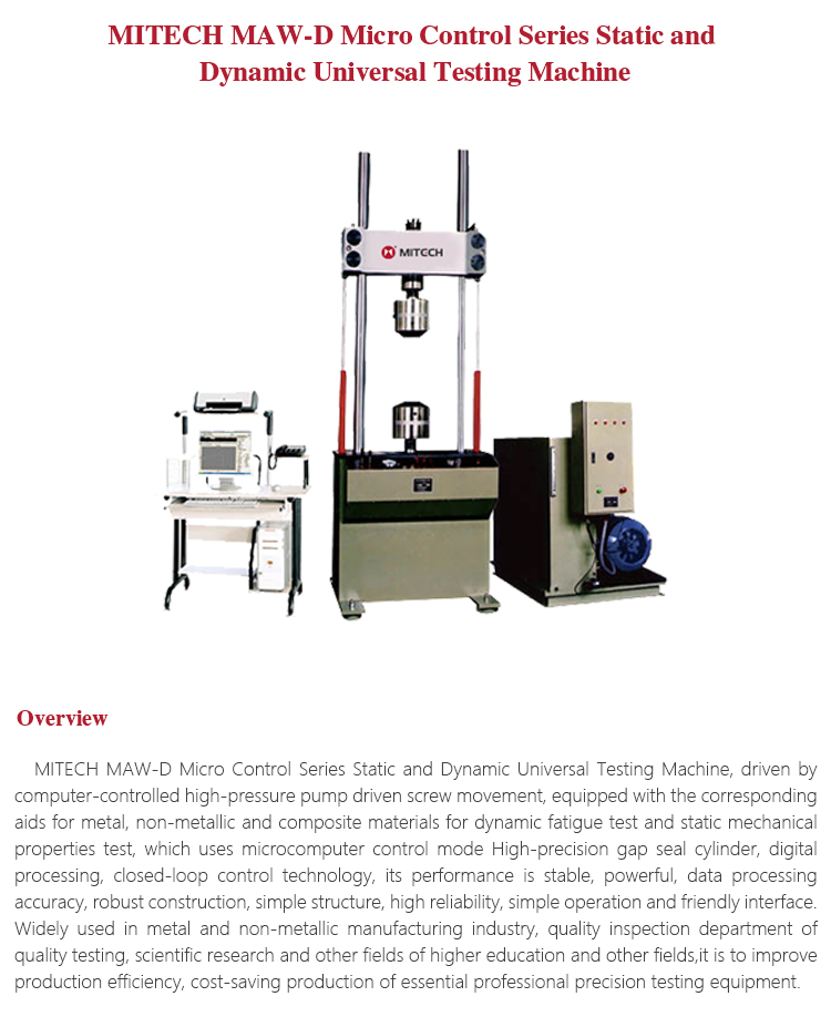 MITECH MAW-D Micro Control Series Static and Dynamic Universal Testing Machine, driven by computer-controlled high-pressure pump driven screw movement, equipped with the corresponding aids for metal, non-metallic and composite materials for dynamic fatigue test and static mechanical properties test, which uses microcomputer control mode High-precision gap seal cylinder, digital processing, closed-loop control technology, its performance is stable, powerful, data processing accuracy, robust construction, simple structure, high reliability, simple operation and friendly interface. Widely used in metal and non-metallic manufacturing industry, quality inspection department of quality testing, scientific research and other fields of higher education and other fields,it is to improve production efficiency, cost-saving production of essential professional precision testing equipment.