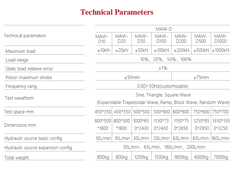 MITECH MAW-D Micro Control Series Static and Dynamic Universal Testing Machine, driven by computer-controlled high-pressure pump driven screw movement, equipped with the corresponding aids for metal, non-metallic and composite materials for dynamic fatigue test and static mechanical properties test, which uses microcomputer control mode High-precision gap seal cylinder, digital processing, closed-loop control technology, its performance is stable, powerful, data processing accuracy, robust construction, simple structure, high reliability, simple operation and friendly interface. Widely used in metal and non-metallic manufacturing industry, quality inspection department of quality testing, scientific research and other fields of higher education and other fields,it is to improve production efficiency, cost-saving production of essential professional precision testing equipment.