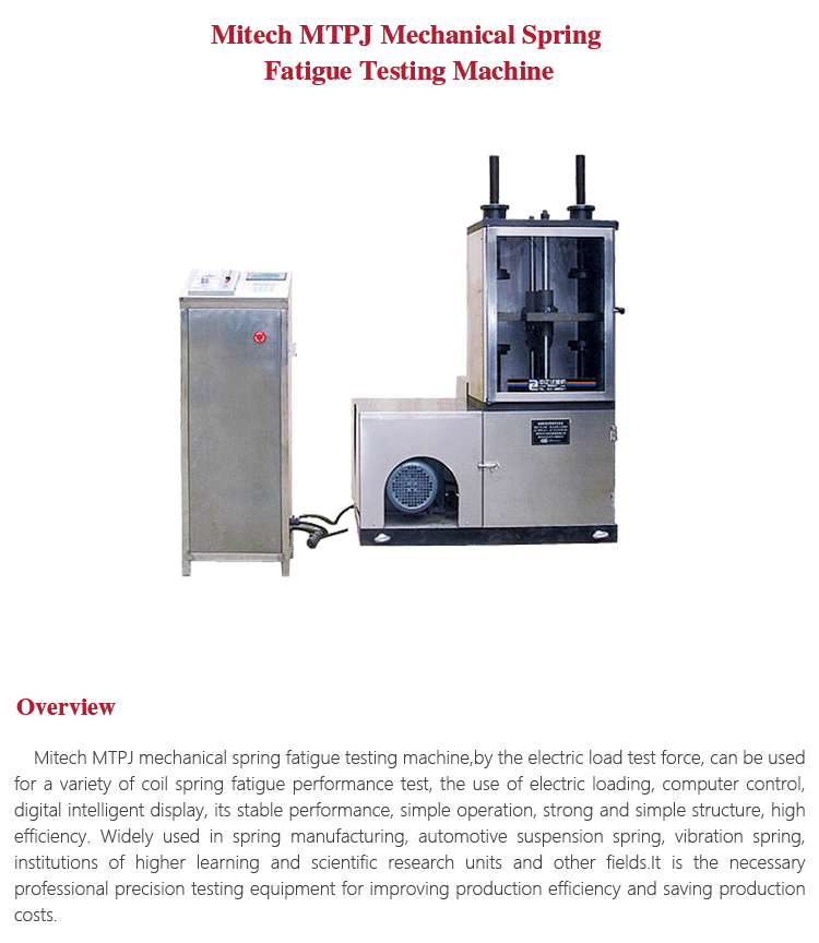 Mitech MTPJ mechanical spring fatigue testing machine,by the electric load test force, can be used for a variety of coil spring fatigue performance test, the use of electric loading, computer control, digital intelligent display, its stable performance, simple operation, strong and simple structure, high efficiency. Widely used in spring manufacturing, automotive suspension spring, vibration spring, institutions of higher learning and scientific research units and other fields.It is the necessary professional precision testing equipment for improving production efficiency and saving production costs.