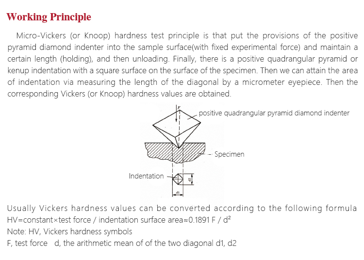 Micro-Vickers (or Knoop) hardness test principle is that put the provisions of the positive pyramid diamond indenter into the sample surface(with fixed experimental force) and maintain a certain length (holding), and then unloading. Finally, there is a positive quadrangular pyramid or kenup indentation with a square surface on the surface of the specimen. Then we can attain the area of indentation via measuring the length of the diagonal by a micrometer eyepiece. Then the corresponding Vickers (or Knoop) hardness values are obtaine.