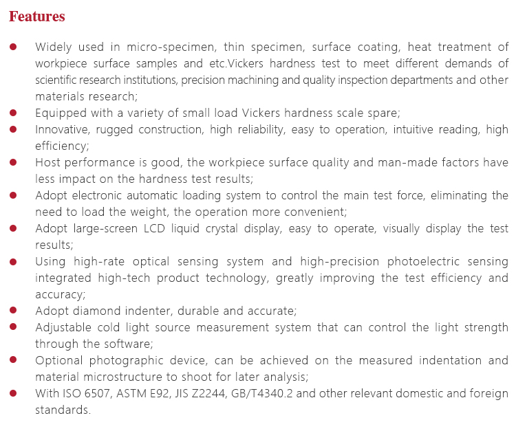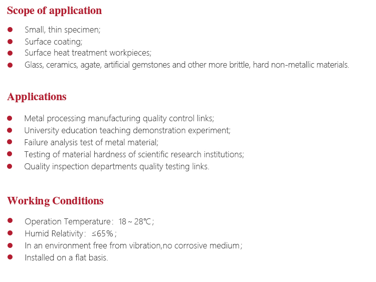 Widely used in micro-specimen, thin specimen, surface coating, heat treatment of workpiece surface samples and etc.Vickers hardness test to meet different demands of scientific research institutions, precision machining and quality inspection departments and other materials research;