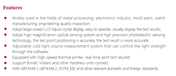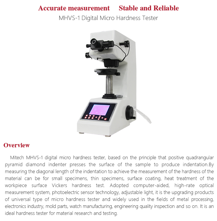 Mitech MHVS-1digital micro hardness tester, based on the principle that positive quadrangular pyramid diamond indenter presses the surface of the sample to produce indentation.By measuring the diagonal length of the indentation to achieve the measurement of the hardness of the material can be for small specimens, thin specimens, surface coating, heat treatment of the workpiece surface Vickers hardness test. Adopted computer-aided, high-rate optical measurement system, photoelectric sensor technology, adjustable light, it is the upgrading products of universal type of micro hardness tester and widely used in the fields of metal processing, electronics industry, mold parts, watch manufacturing, engineering quality inspection and so on. It is an ideal hardness tester for material research and testing.