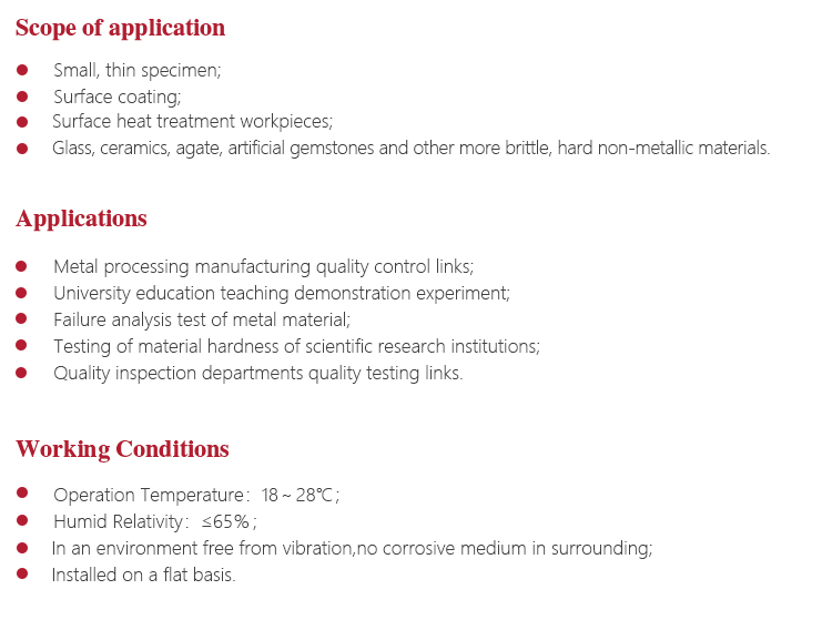 Micro-Vickers (or Knoop) hardness test principle is that put the provisions of the positive pyramid diamond indenter into the sample surface(with fixed experimental force) and maintain a certain length (holding), and then unloading. Finally, there is a positive quadrangular pyramid or kenup indentation with a square surface on the surface of the specimen. Then we can attain the area of indentation via measuring the length of the diagonal by a micrometer eyepiece. Then the corresponding Vickers (or Knoop) hardness values are obtained.