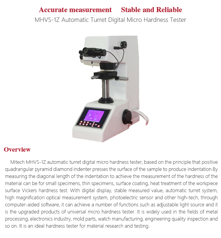 Mitech MHVS-1Z automatic turret digital micro hardness tester, based on the principle that positive quadrangular pyramid diamond indenter presses the surface of the sample to produce indentation.By measuring the diagonal length of the indentation to achieve the measurement of the hardness of the material can be for small specimens, thin specimens, surface coating, heat treatment of the workpiece surface Vickers hardness test. With digital display, stable measured value, automatic turret system, high magnification optical measurement system, photoelectric sensor and other high-tech, through computer-aided software, it can achieve a number of functions such as adjustable light source and it is the upgraded products of universal micro hardness tester. It is widely used in the fields of metal processing, electronics industry, mold parts, watch manufacturing, engineering quality inspection and so on. It is an ideal hardness tester for material research and testing.