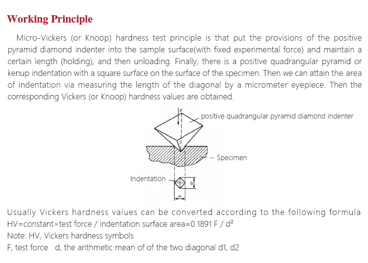Micro-Vickers (or Knoop) hardness test principle is that put the provisions of the positive pyramid diamond indenter into the sample surface(with fixed experimental force) and maintain a certain length (holding), and then unloading. Finally, there is a positive quadrangular pyramid or kenup indentation with a square surface on the surface of the specimen. Then we can attain the area of indentation via measuring the length of the diagonal by a micrometer eyepiece. Then the corresponding Vickers (or Knoop) hardness values are obtained.