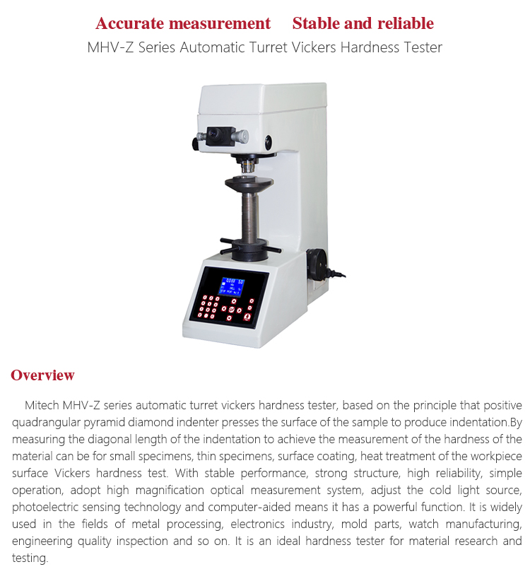 Mitech MHV-Z series automatic turret vickers hardness tester, based on the principle that positive quadrangular pyramid diamond indenter presses the surface of the sample to produce indentation.By measuring the diagonal length of the indentation to achieve the measurement of the hardness of the material can be for small specimens, thin specimens, surface coating, heat treatment of the workpiece surface Vickers hardness test. With stable performance, strong structure, high reliability, simple operation, adopt high magnification optical measurement system, adjust the cold light source, photoelectric sensing technology and computer-aided means it has a powerful function. It is widely used in the fields of metal processing, electronics industry, mold parts, watch manufacturing, engineering quality inspection and so on. It is an ideal hardness tester for material research and testing.