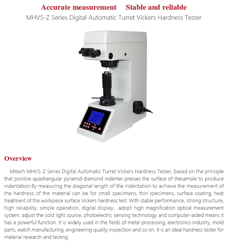 Mitech MHVS-Z Series Digital Automatic Turret Vickers Hardness Tester, based on the principle that positive quadrangular pyramid diamond indenter presses the surface of thesample to produce indentation.By measuring the diagonal length of the indentation to achieve the measurement of the hardness of the material can be for small specimens, thin specimens, surface coating, heat treatment of the workpiece surface Vickers hardness test. With stable performance, strong structure, high reliability, simple operation, digital display,adopt high magnification optical measurement system, adjust the cold light source, photoelectric sensing technology and computer-aided means it has a powerful function. It is widely used in the fields of metal processing, electronics industry, mold parts, watch manufacturing, engineering quality inspection and so on. It is an ideal hardness tester for material research and testing.