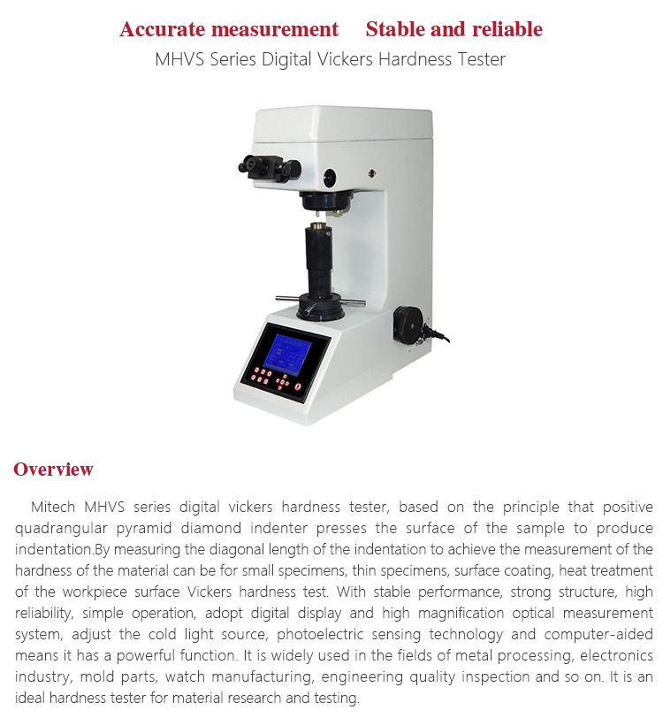 Mitech MHVS series digital vickers hardness tester, based on the principle that positive quadrangular pyramid diamond indenter presses the surface of the sample to produce indentation.By measuring the diagonal length of the indentation to achieve the measurement of the hardness of the material can be for small specimens, thin specimens, surface coating, heat treatment of the workpiece surface Vickers hardness test. With stable performance, strong structure, high reliability, simple operation, adopt digital display and high magnification optical measurement system, adjust the cold light source, photoelectric sensing technology and computer-aided means it has a powerful function. It is widely used in the fields of metal processing, electronics industry, mold parts, watch manufacturing, engineering quality inspection and so on. It is an ideal hardness tester for material research and testing.
