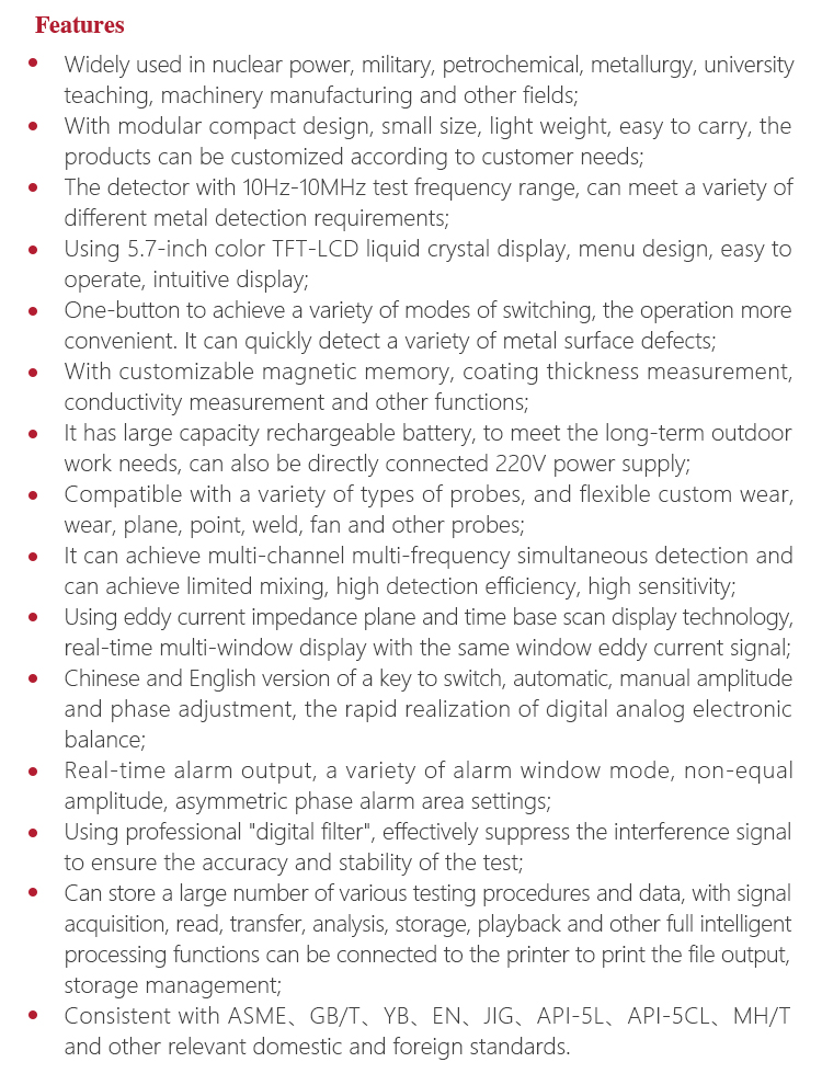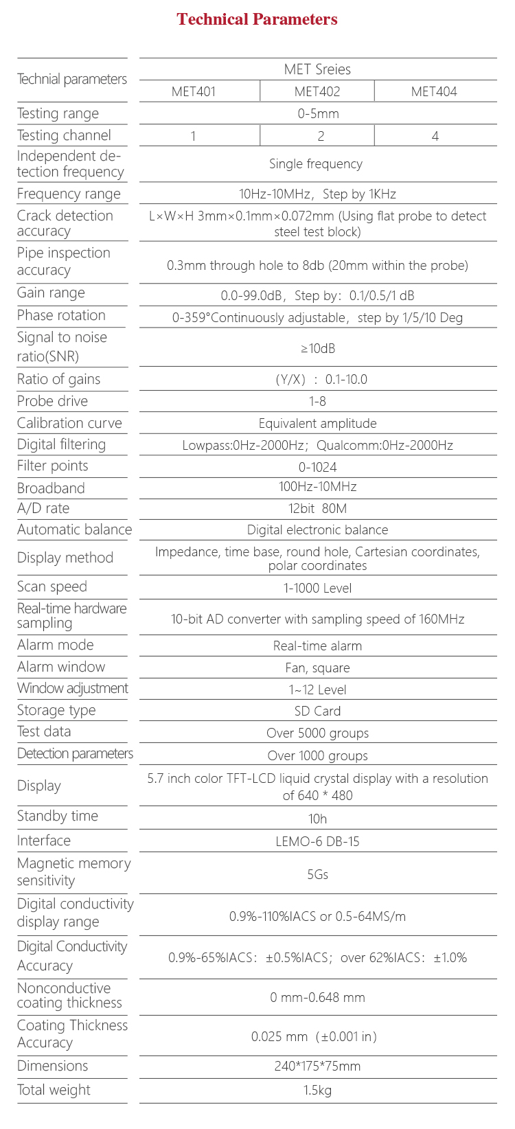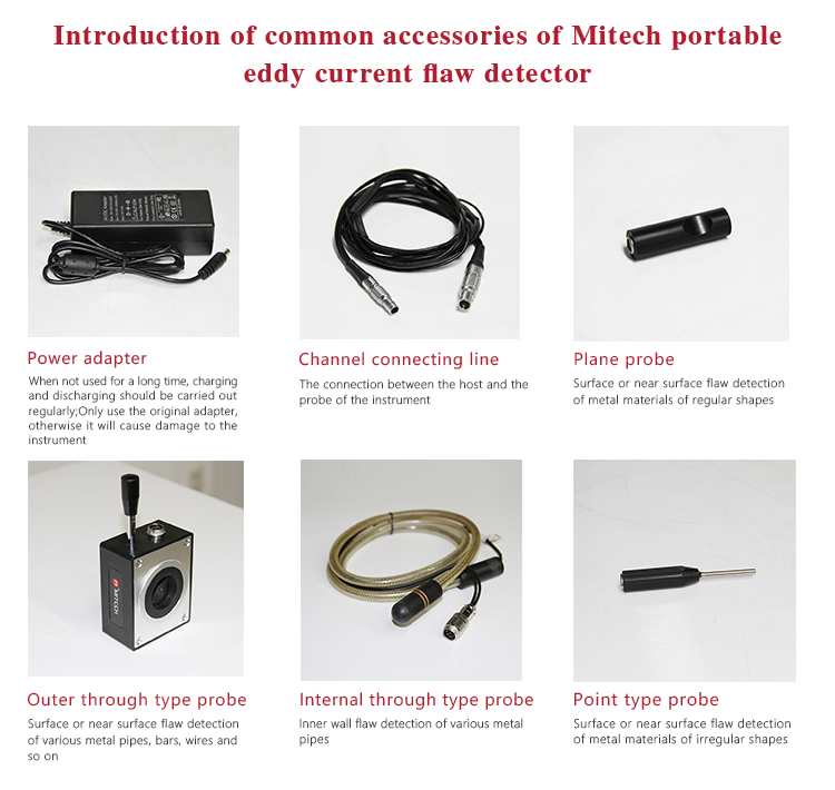 Mitech MET Series Portable Eddy Current Flaw Detector,also known as digital electromagnetic detecor,based on the principle of electromagnetic induction,can detect various metal parts surface or near surface defects with high-speed. It uses advanced DSP digital processing and FPGA technology innovation designed, with 5.7-inch TFT LCD screen, can clearly display the detection data.The product has high sensitivity, stable performance, multi-channel simultaneous detection and intelligent data analysis, can be equipped with intelligent probe, can also be customized probe according to customer needs , with extended magnetic memory, coating thickness, conductivity measurement and other practical Features. It is widely used in all kinds of metal pipe rods, auto parts, bearings, oil casing, oil control rods, ring metal parts in non-destructive testing and scientific research and other areas of higher education research.It is the necessary professional precision testing equipment to improve production efficiency, saving production costs.