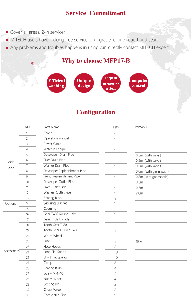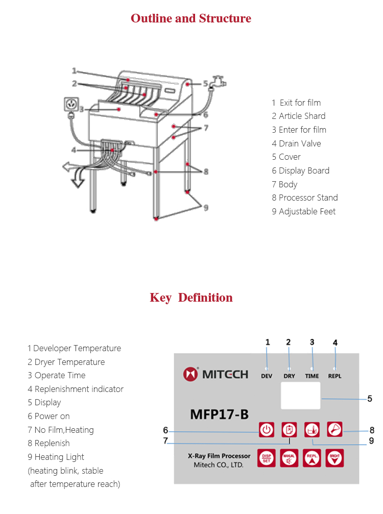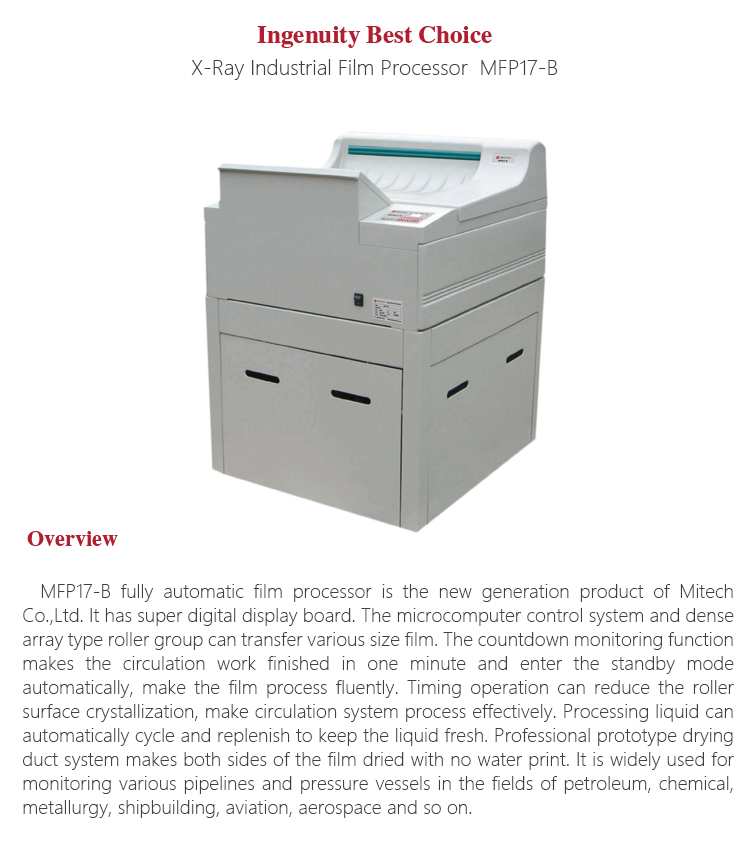 MFP17-B fully automatic film processor is the new generation product of Mitech Co.,Ltd. It has super digital display board, the microcomputer control system and dense array type roller group can transfer various size film. The countdown monitoring function makes the circulation work finished in one minute and enter the standby mode automatically. Processing liquid can automatically cycle and replenish to keep the liquid fresh. Professional prototype drying duct system makes both sides of the film dried with no water print. It is widely used for monitoring various pipelines and pressure vessels in the fields of petroleum, chemical, metallurgy, shipbuilding, aviation, aerospace and so on.