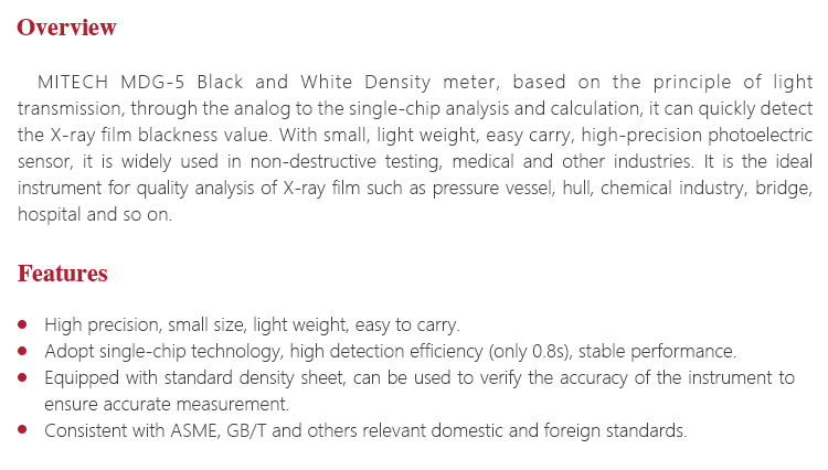 MITECH MDG-5 Black and White Density meter, based on the principle of light transmission, through the analog to the single-chip analysis and calculation, it can quickly detect the X-ray film blackness value. With small, light weight, easy carry, high-precision photoelectric sensor, it is widely used in non-destructive testing, medical and other industries. It is the ideal instrument for quality analysis of X-ray film such as pressure vessel, hull, chemical industry, bridge, hospital and so on.