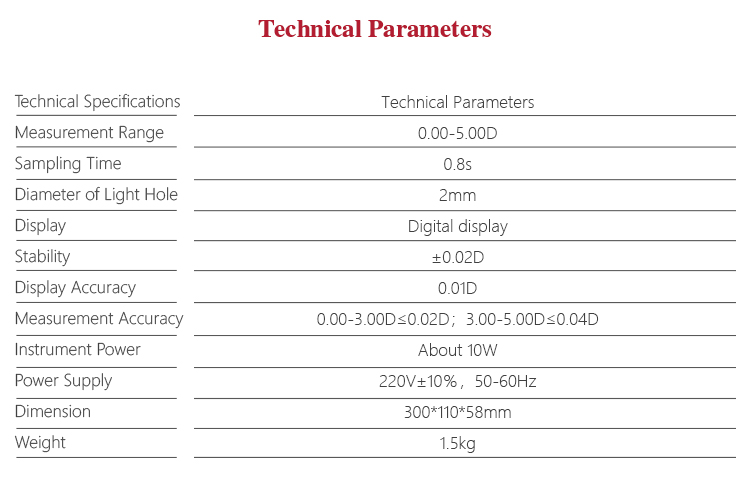 Measurement Accuracy | 0.00-3.00D≤0.02D;3.00-5.00D≤0.04D |
