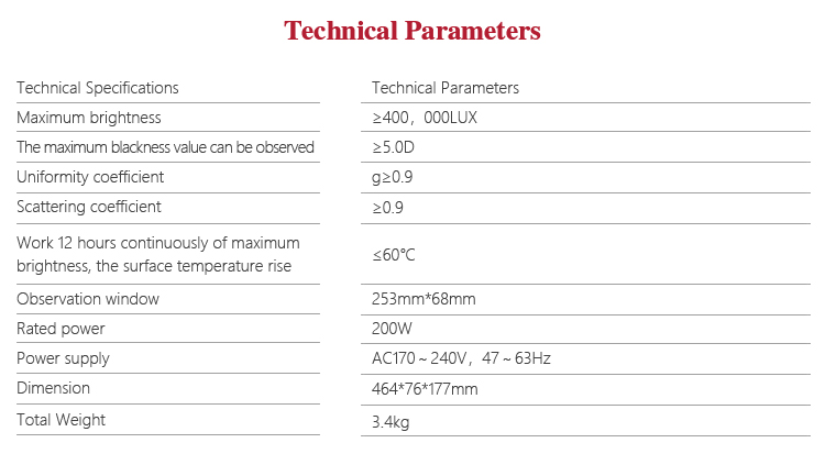 The principle of the LED view lamp is fixxing the film containing the image information on the observation screen, then the light emitted from the inner light source is scattered through the film through the observation screen to see if there is a defect on the film, and the sample is qualified according to the relevant standard