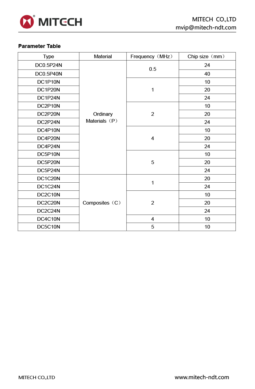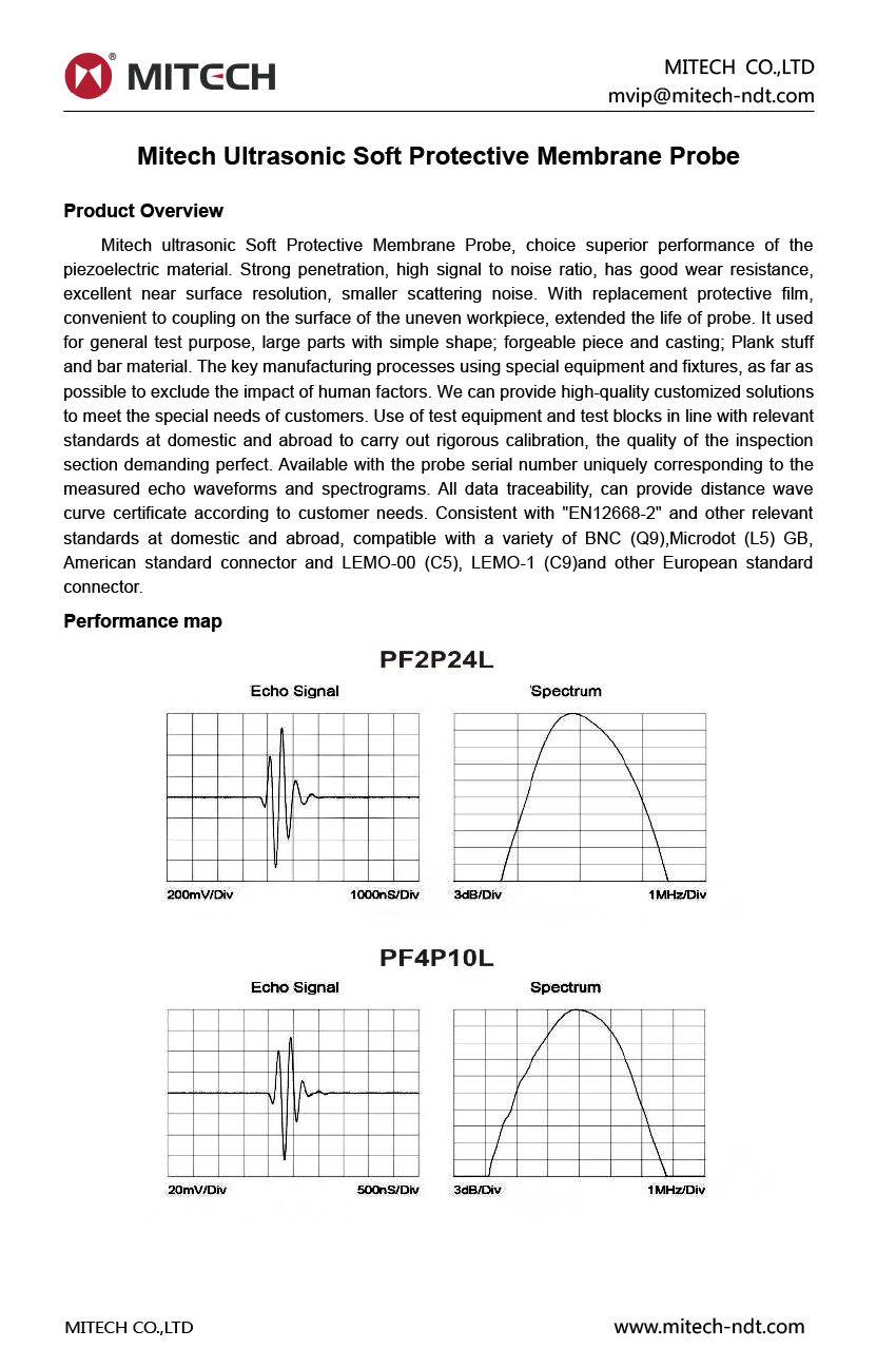 Mitech ultrasonic soft protective membrane probe, choice superior performance of the piezoelectric material. Strong penetration, high signal to noise ratio, has good wear resistance, excellent near surface resolution, smaller scattering noise. With replacement protective film, convenient to coupling on the surface of the uneven workpiece, extended the life of probe. It used for general test purpose, large parts with simple shape; forgeable piece and casting; Plank stuff and bar material. The key manufacturing processes using special equipment and fixtures, as far as possible to exclude the impact of human factors. We can provide high-quality customized solutions to meet the special needs of customers. Use of test equipment and test blocks in line with relevant standards at domestic and abroad to carry out rigorous calibration, the quality of the inspection section demanding perfect. Available with the probe serial number uniquely corresponding to the measured echo waveforms and spectrograms. All data traceability, can provide distance wave curve certificate according to customer needs. Consistent with "EN12668-2" and other relevant standards at domestic and abroad, compatible with a variety of BNC (Q9),Microdot (L5) GB, American standard connector and LEMO-00 (C5), LEMO-1 (C9)and other European standard connector.