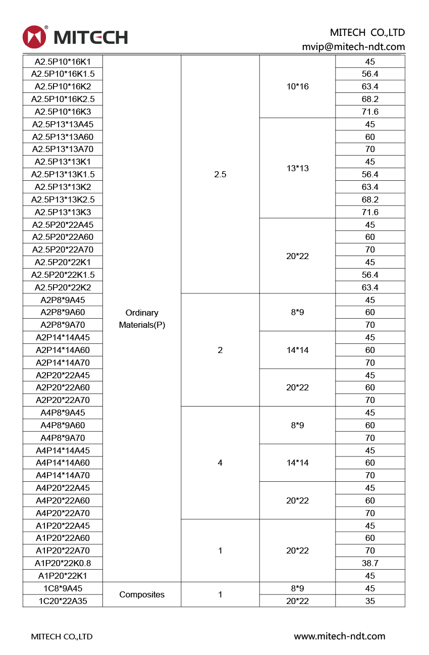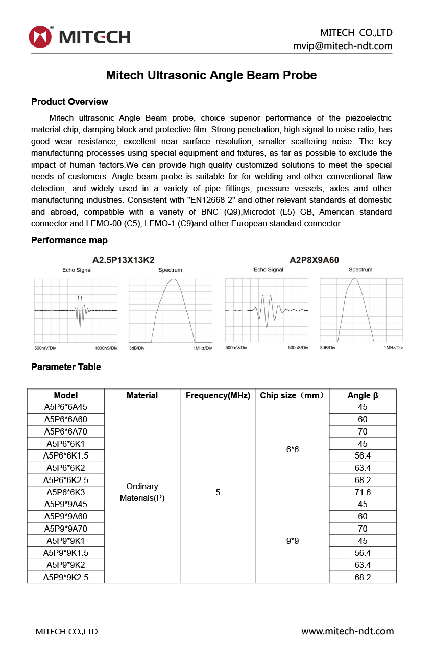 Mitech ultrasonic Angle Beam probe, choice superior performance of the piezoelectric material chip, damping block and protective film. Strong penetration, high signal to noise ratio, has good wear resistance, excellent near surface resolution, smaller scattering noise. The key manufacturing processes using special equipment and fixtures, as far as possible to exclude the impact of human factors.We can provide high-quality customized solutions to meet the special needs of customers. Angle beam probe is suitable for for welding and other conventional flaw detection, and widely used in a variety of pipe fittings, pressure vessels, axles and other manufacturing industries. Consistent with "EN12668-2" and other relevant standards at domestic and abroad, compatible with a variety of BNC (Q9),Microdot (L5) GB, American standard connector and LEMO-00 (C5), LEMO-1 (C9)and other European standard connector.