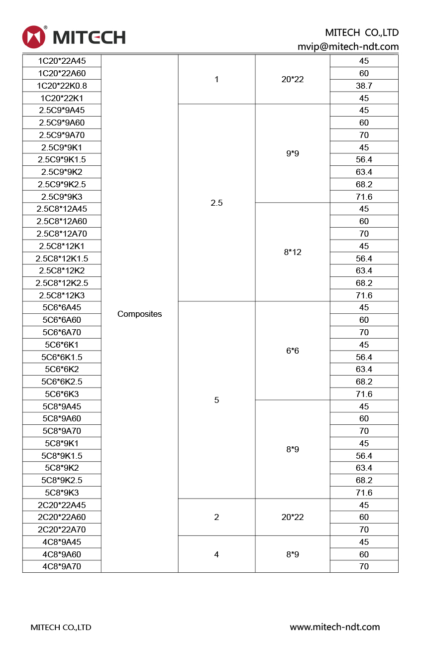 Mitech ultrasonic Angle Beam probe, choice superior performance of the piezoelectric material chip, damping block and protective film. Strong penetration, high signal to noise ratio, has good wear resistance, excellent near surface resolution, smaller scattering noise. The key manufacturing processes using special equipment and fixtures, as far as possible to exclude the impact of human factors.We can provide high-quality customized solutions to meet the special needs of customers. Angle beam probe is suitable for for welding and other conventional flaw detection, and widely used in a variety of pipe fittings, pressure vessels, axles and other manufacturing industries. Consistent with "EN12668-2" and other relevant standards at domestic and abroad, compatible with a variety of BNC (Q9),Microdot (L5) GB, American standard connector and LEMO-00 (C5), LEMO-1 (C9)and other European standard connector.
