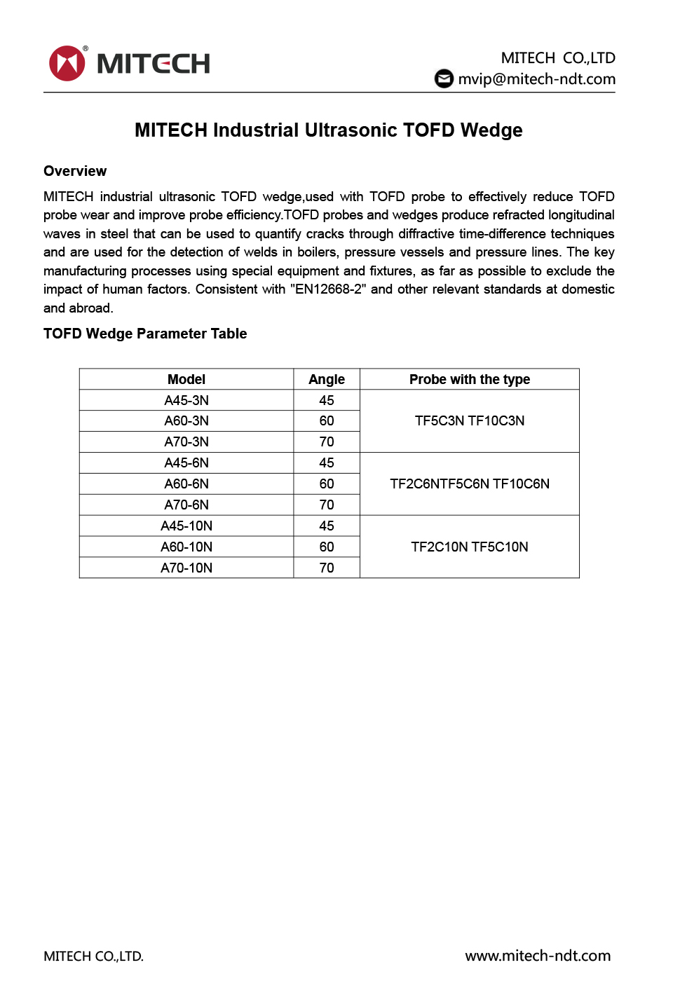 MITECH industrial ultrasonic TOFD wedge,used with TOFD probe to effectively reduce TOFD probe wear and improve probe efficiency.TOFD probes and wedges produce refracted longitudinal waves in steel that can be used to quantify cracks through diffractive time-difference techniques and are used for the detection of welds in boilers, pressure vessels and pressure lines. The key manufacturing processes using special equipment and fixtures, as far as possible to exclude the impact of human factors. Consistent with "EN12668-2" and other relevant standards at domestic and abroad.