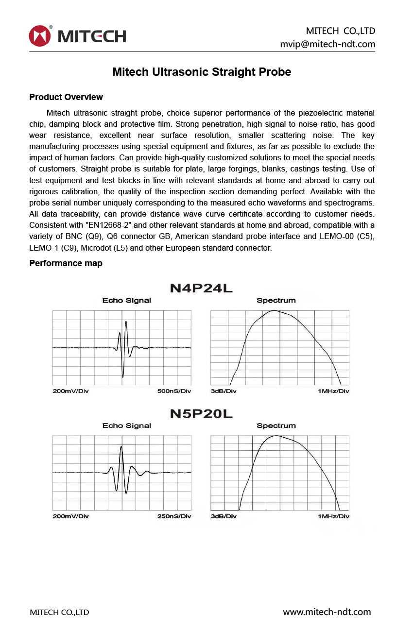 Mitech ultrasonic straight probe, choice superior performance of the piezoelectric material chip, damping block and protective film. Strong penetration, high signal to noise ratio, has good wear resistance, excellent near surface resolution, smaller scattering noise. The key manufacturing processes using special equipment and fixtures, as far as possible to exclude the impact of human factors. Can provide high-quality customized solutions to meet the special needs of customers. Straight probe is suitable for plate, large forgings, blanks, castings testing. Use of test equipment and test blocks in line with relevant standards at home and abroad to carry out rigorous calibration, the quality of the inspection section demanding perfect. Available with the probe serial number uniquely corresponding to the measured echo waveforms and spectrograms. All data traceability, can provide distance wave curve certificate according to customer needs. Consistent with "EN12668-2" and other relevant standards at home and abroad, compatible with a variety of BNC (Q9), Q6 connector GB, American standard probe interface and LEMO-00 (C5), LEMO-1 (C9), Microdot (L5) and other European standard connector.