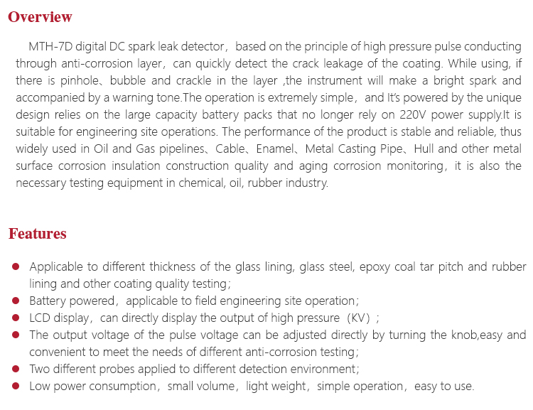 MTH-7D digital DC spark leak detector,based on the principle of high pressure pulse conducting through anti-corrosion layer,can quickly detect the crack leakage of the coating. While using, if there is pinhole、bubble and crackle in the layer ,the instrument will make a bright spark and accompanied by a warning tone.The operation is extremely simpleand It’s powered by the unique design relies on the large capacity battery packs that no longer rely on 220V power supply.It is suitable for engineering site operations. The performance of the product is stable and reliable, thus widely used in Oil and Gas pipelines、Cable、Enamel、Metal Casting PipeHull and other metal surface corrosion insulation construction quality and aging corrosion monitoring,it is also the necessary testing equipment in chemical, oil, rubber industry.