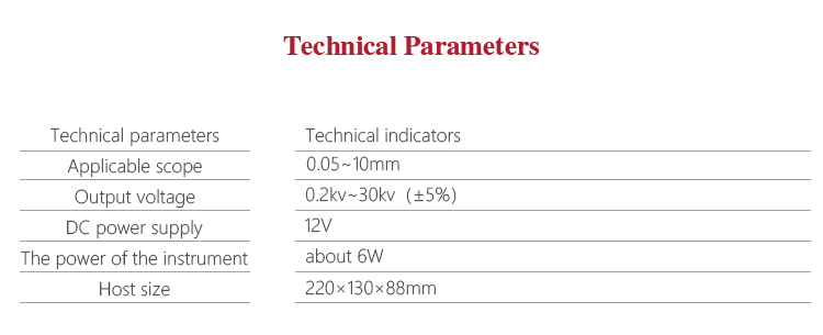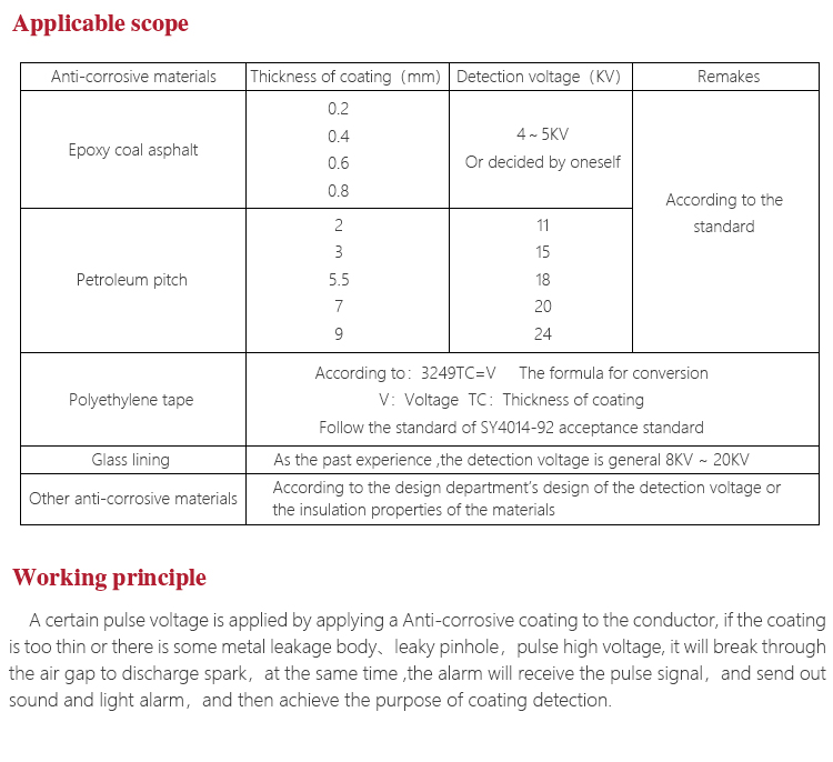 A certain pulse voltage is applied by applying a Anti-corrosive coating to the conductor, if the coating is too thin or there is some metal leakage bodyleaky pinhole,pulse high voltage, it will break through the air gap to discharge spark,at the same time ,the alarm will receive the pulse signaland send out sound and light alarm,and then achieve the purpose of coating detection.
