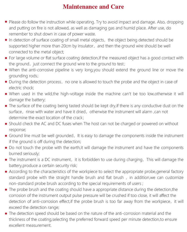 l The surface of the coating being tasted should be kept dry,if there is any conductive dust on the surface,rinse with water and have it dried,otherwise the instrument will alarm ,can not determine the exact location of the crack;