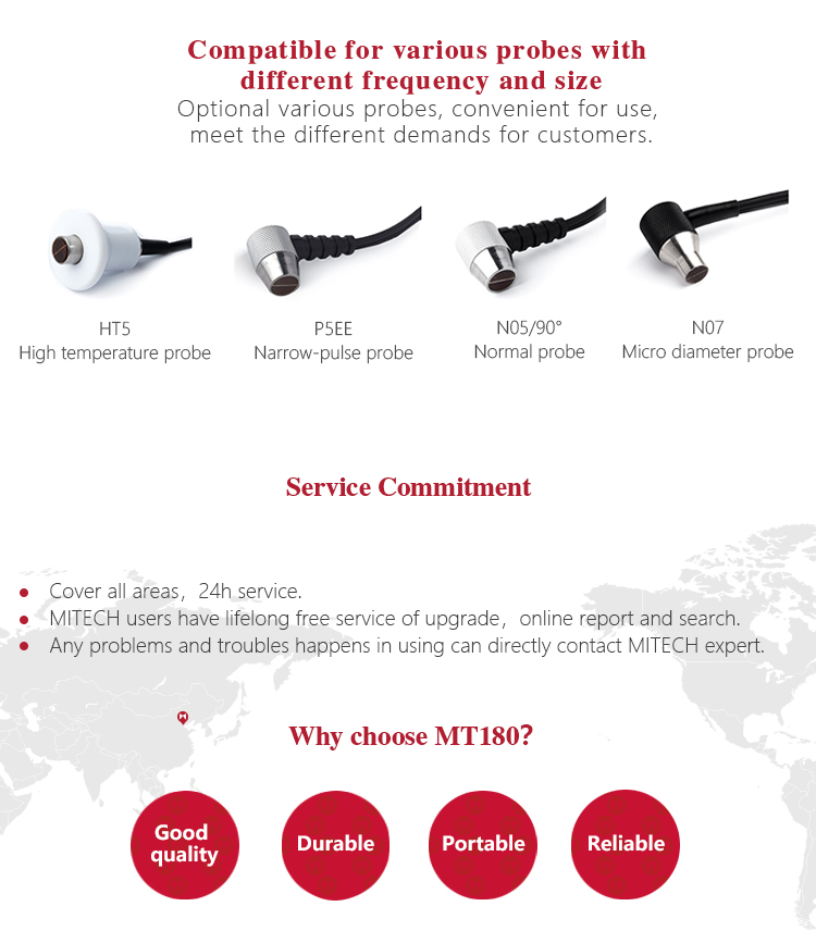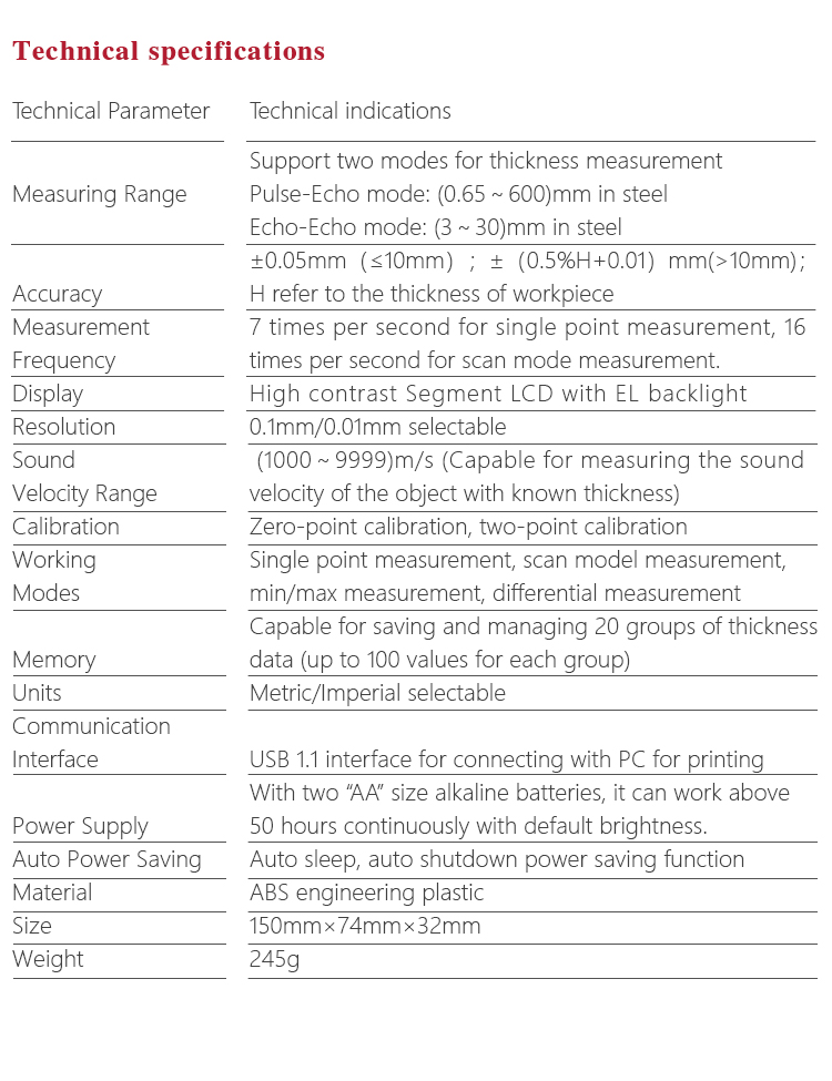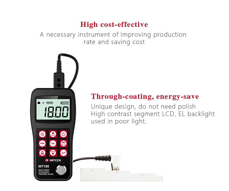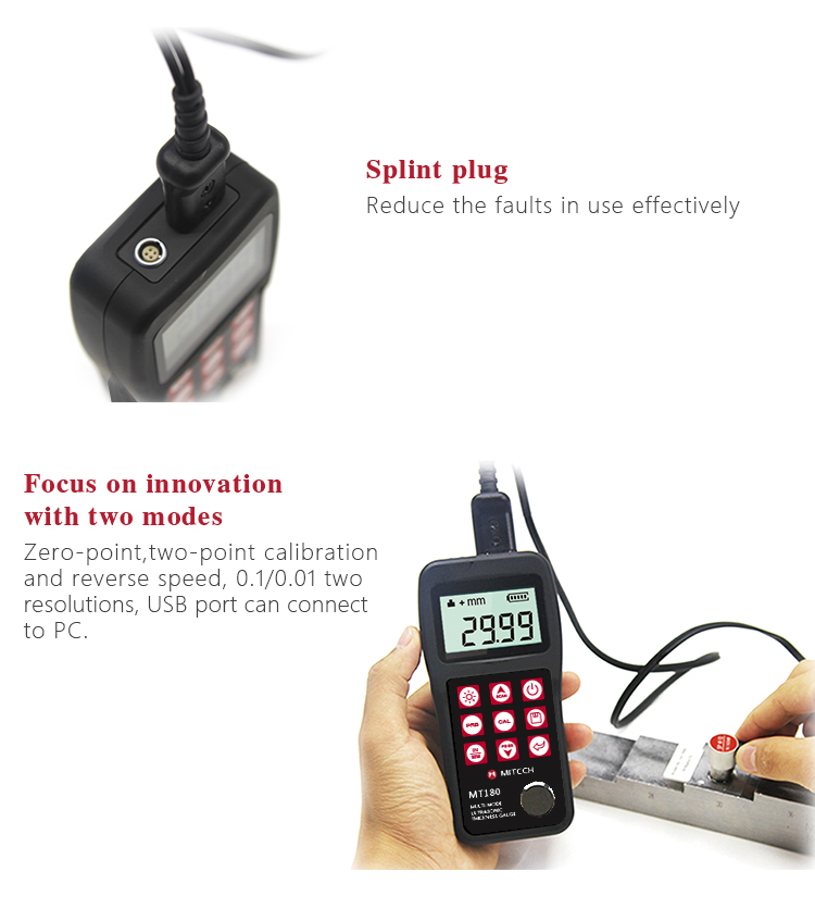 Miteh MT180 multi-mode ultrasonic thickness gauge, based on ultrasonic measuring principle, it can perform thickness measurements on a wide range of materials including metals, plastic, ceramics glass and other ultrasonic well-conductive materials. It is also capable for measuring the sound velocity of the object with known thickness. Compared with the traditional measurement method, the advantage of ultrasonic thickness gauge is that it can finish the measurement only if it contacts with one side of the measured workpiece. Its unique performance of capable for testing thickness through the coating provides efficient solution for testing the workpiece of coated surface or corrosion materials. It can test the workpiece directly without needing to get rid of the surface coating. It’s widely used for monitoring the production equipments’ various pipelines and pressure vessel corrosion reducing degree in the fields of petroleum, chemical, metallurgy, shipbuilding, aviation, aerospace and so on. It also can be used for making accurate measurement to various plates and machining parts. It is the necessary professional precision instrument for improving the production efficiency and qualification rate as well as saving cost.
