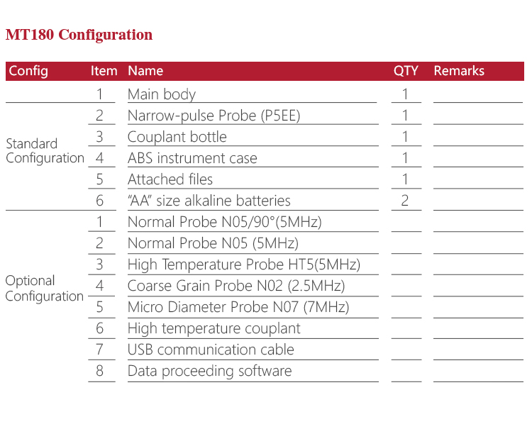 Capable of performing measurements on a wide range of material, including metals, plastic, ceramics, composites, epoxies, glass and other ultrasonic wave well-conductive materials.Transducer models are available for special application, including for coarse grain material and high temperature applications.