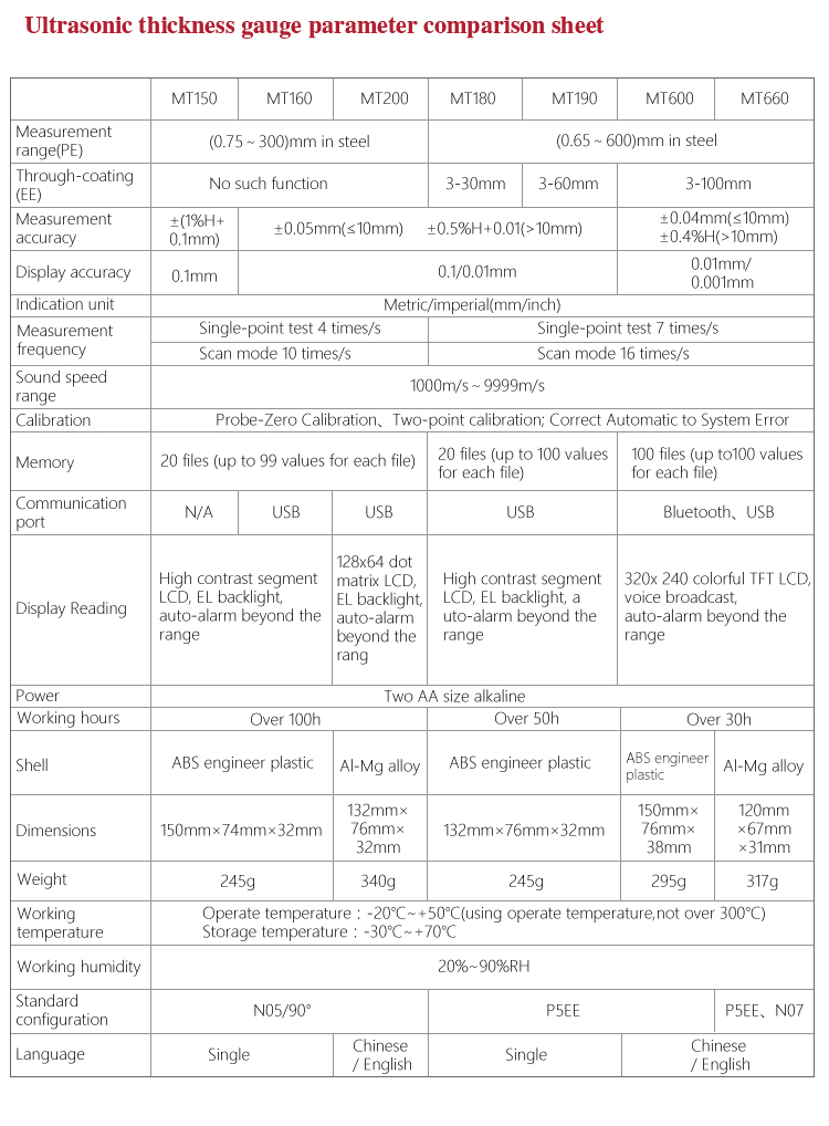 Mitech series ultrasonic thickness gauges, with low-power design and long standby, MT150/MT160/MT200/MT180/MT190/MT600/MT660 are with two AA size alkaline batteries for power supply, easy to replace.