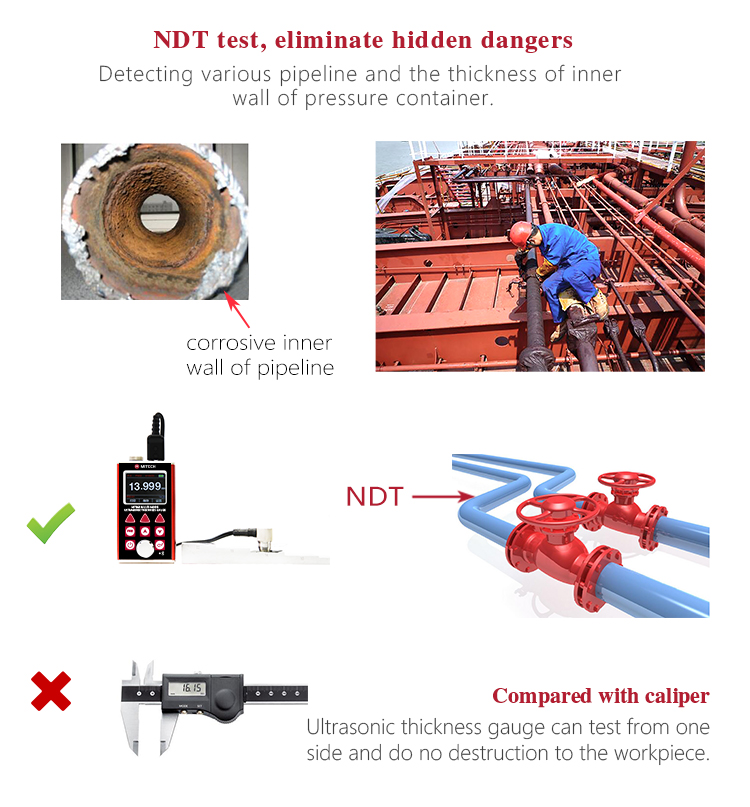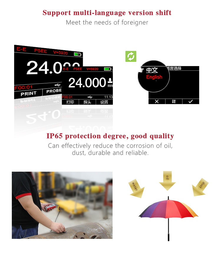 Multi-mode: Pulse-Echo mode (P-E mode) and Echo-Echo mode (E-E mode). In Echo-Echo mode, it can test the wall thickness eliminating paint or coating thickness.