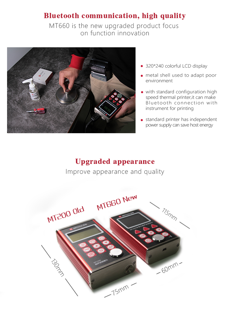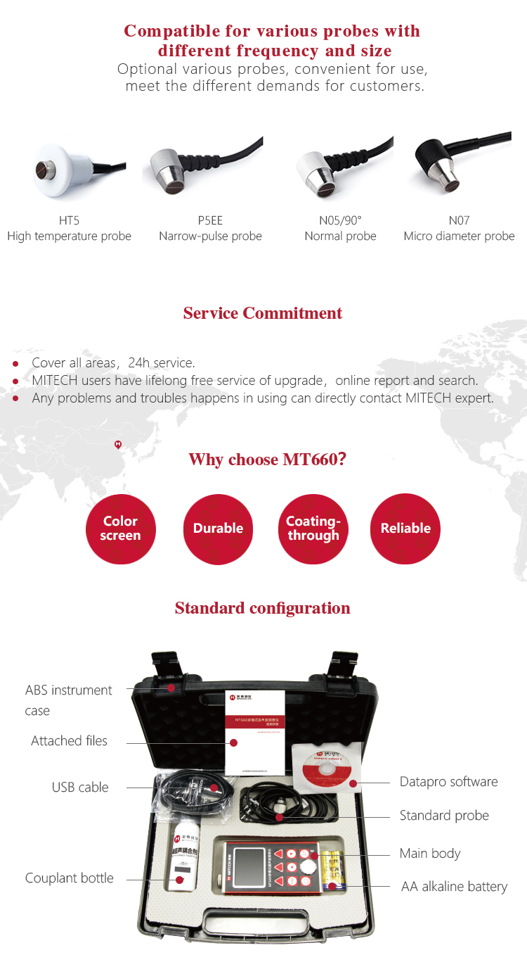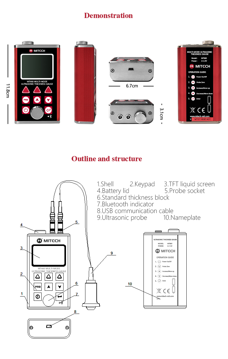 MT660 multi-mode ultrasonic thickness gauge is the newest promoted upgraded product by Mitech. It pays more attention to user experience and functional innovation. Adopted with 320*240 colorful LCD display, it can show you clear measurement result under dim light and strong sunshine environment, improved the visual experience greatly. Sealed aluminum-magnesium alloy case delicate design, smaller volume, better quality are specially designed for defense against oil, dust in the bad sit environment. With intelligent warning function, it will promote automatically when beyond the setting range, it is convenient for reading. It can meet the efficient collecting material’s multiple points’ thickness accurate testing demand. It supports 0.001 high accuracy display and Bluetooth communication. With through coating mode and common mode, its unique performance of capable for testing thickness through the coating provides efficient solution for testing the workpiece of coated surface or corrosion materials. It can measure the workpiece directly without needing to get rid of the surface coating before measurement. It’s widely used for monitoring the production equipments’ various pipelines and pressure vessel corrosion reducing degree in the fields of petroleum, chemical, metallurgy, shipbuilding, aviation, aerospace and so on. It also can be used for making accurate measurement to various plates and machining parts. It is the necessary professional precision instrument for improving the production efficiency and qualification rate as well as saving cost.