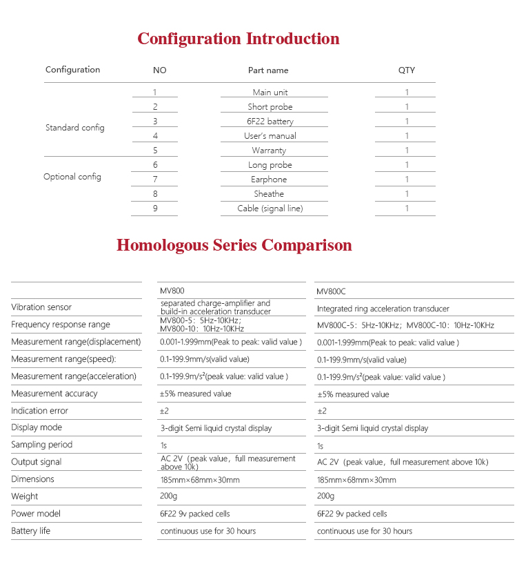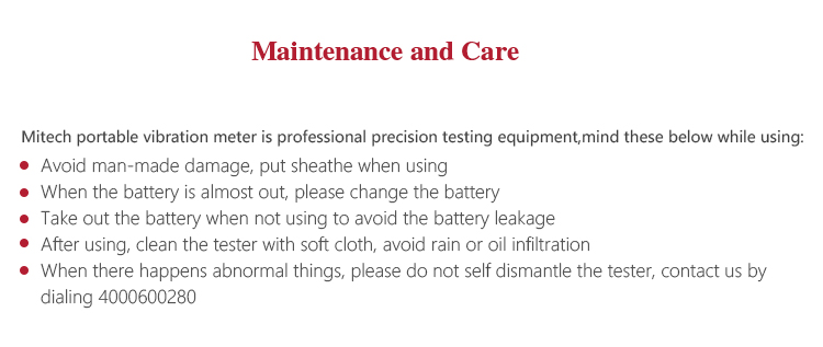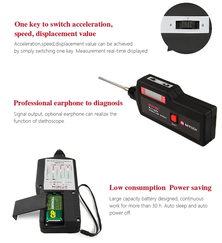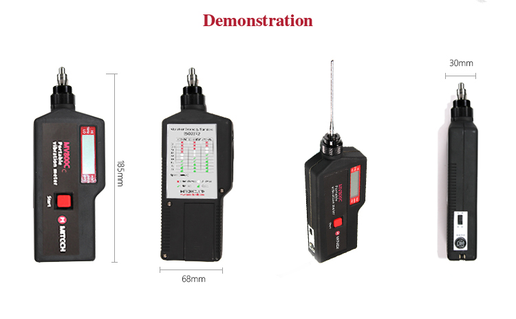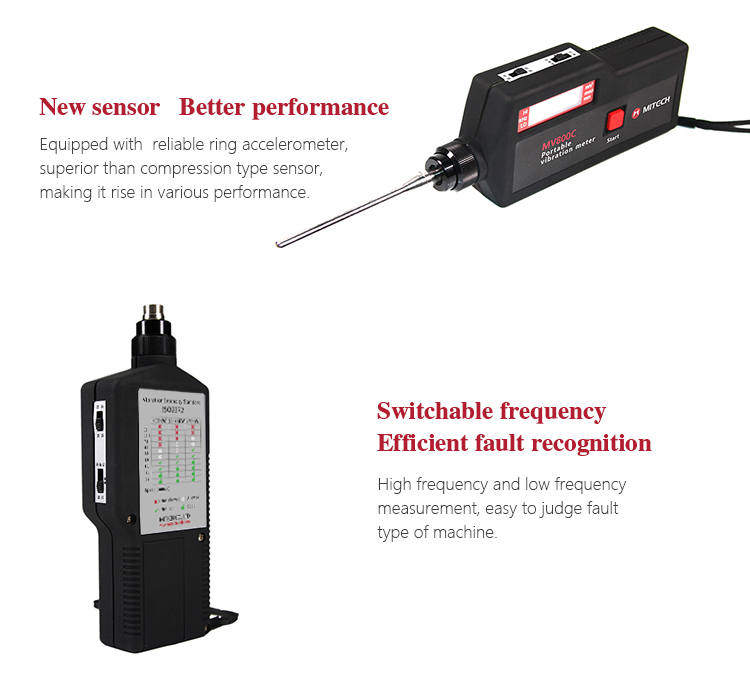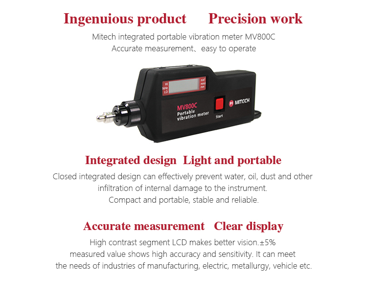 MITECH portable vibration meter MV800C is made up of piezoelectric transducer and digital display circuit. It is mainly used to measure vibration acceleration, speed and displacement of various rotary machine. This product has the advantages of large measurement, wide variety, intuitively demonstration, small size, light weight etc. It is widely used in measurement on site or at height and can reduce the working strength, improve the working efficiency.