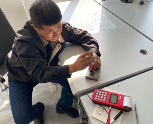 隨后美泰工程師隨李工來到工廠對現(xiàn)場工件做硬度及缺陷檢測,在現(xiàn)場美泰工程師使用里氏硬度計(jì)MH500對現(xiàn)場工件進(jìn)行了硬度測試,最終顯示數(shù)值也十分穩(wěn)定,并且MH500里氏硬度計(jì)支持現(xiàn)場打印測量結(jié)果更便于數(shù)據(jù)留存記錄。
