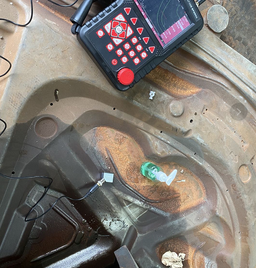在一個(gè)廢棄模具上我們看到工件表面有一道明顯裂縫,李工想檢測一下裂縫深度。美泰工程師使用MUT550B超聲波探傷儀,匹配2.5MHz 9*9單晶斜探頭,對裂縫進(jìn)行深度檢測。最后測得裂縫深度為35mm,李工對檢測檢測結(jié)果表示認(rèn)可。隨后又為客戶展示了MUT550B探傷儀匹配2.5MHz φ14單晶直探頭對其他工件進(jìn)行檢測,測量結(jié)果也十分精確。